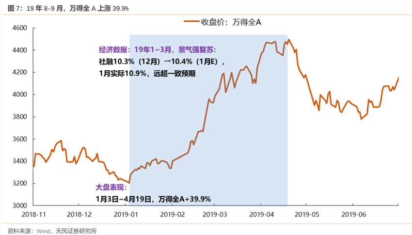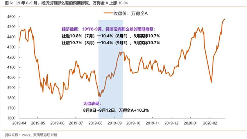 (1)經(jīng)濟(jì)預(yù)期特別差,市場短期可能會因?yàn)榻?jīng)濟(jì)超預(yù)期而修復(fù),但是不一定會趨勢向上,即大盤主要走出反彈而非反轉(zhuǎn)行情。例如19年8-9月,經(jīng)濟(jì)沒有那么差的預(yù)期修復(fù),萬得全A累計上漲10.3%