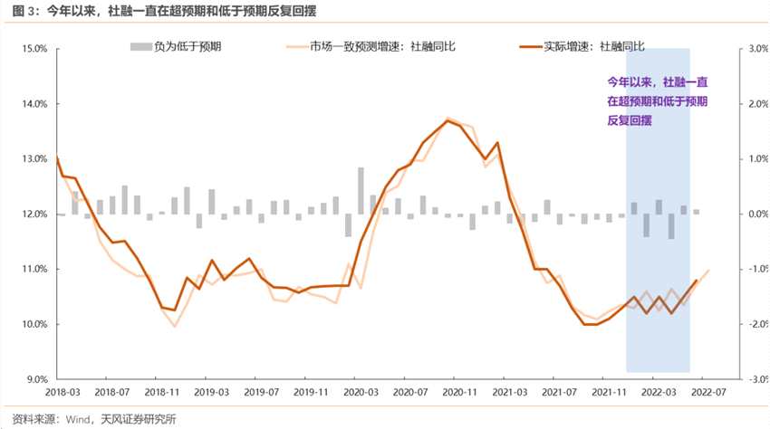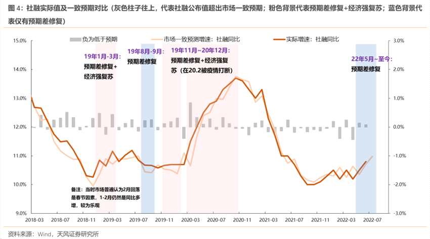 預(yù)期差修復(fù):橙色線高于粉色線,則灰色柱子往上,代表社融公布值超出市場一致預(yù)期。