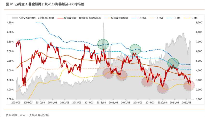 而從定量分析的角度來看,市場重要情緒指標(biāo)——萬得全A非金融的股債收益差,已經(jīng)逼近-2X標(biāo)準(zhǔn)差。