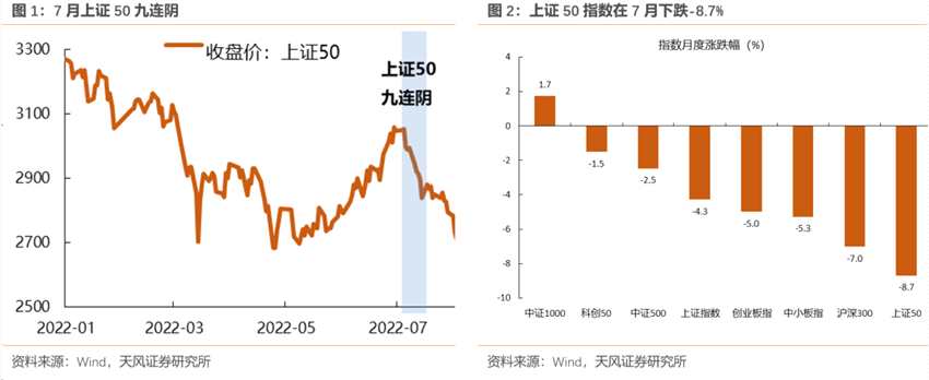 但是到了7月份,預(yù)期再度回擺,7月份初上證50九連陰,并且在7月下跌8.7%,跌幅居主要指數(shù)首位,反映的是市場對經(jīng)濟(jì)預(yù)期再度下調(diào)的判斷。