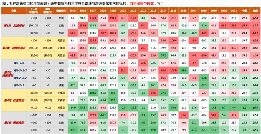 下圖中,每年我們按照財務(wù)指標(biāo)(表格中第二列和第三列)把不同公司分成不同類型,其中30%用來區(qū)分增速快慢,回測發(fā)現(xiàn),市場偏好的順序依次是:【加速增長】≈【持續(xù)高增長】 ≈【減速增長-低降幅】>【困境反轉(zhuǎn)】>【減速增長-高降幅】>【低速穩(wěn)定】。