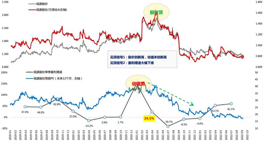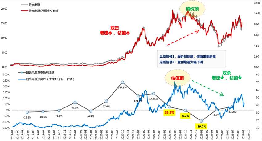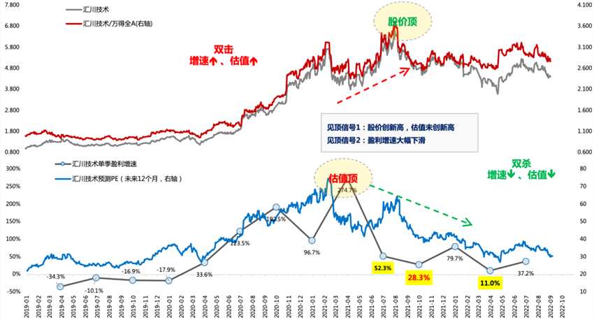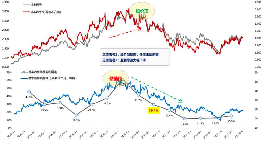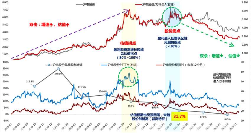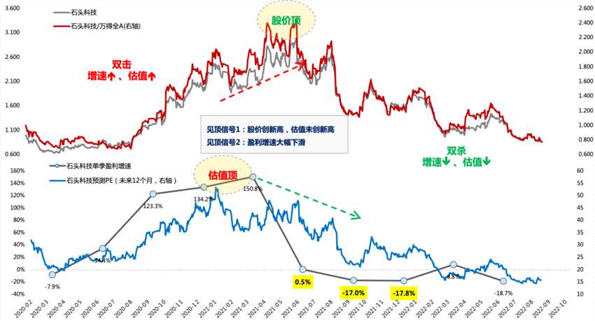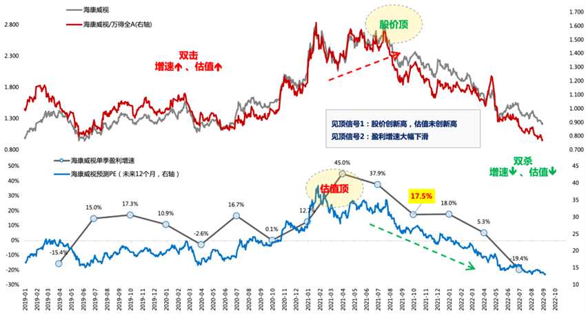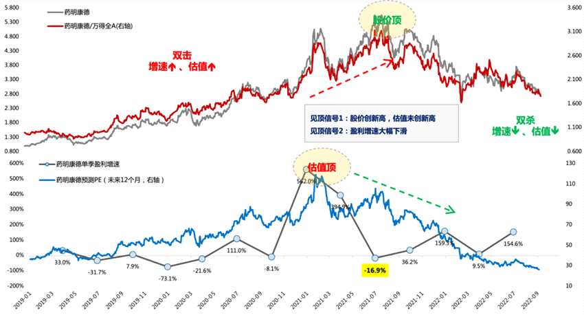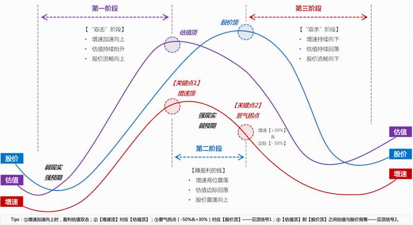 第三階段:戴維斯雙殺,對應(yīng)利潤增速降低到30%附近或者降幅超過50%、股價大跌