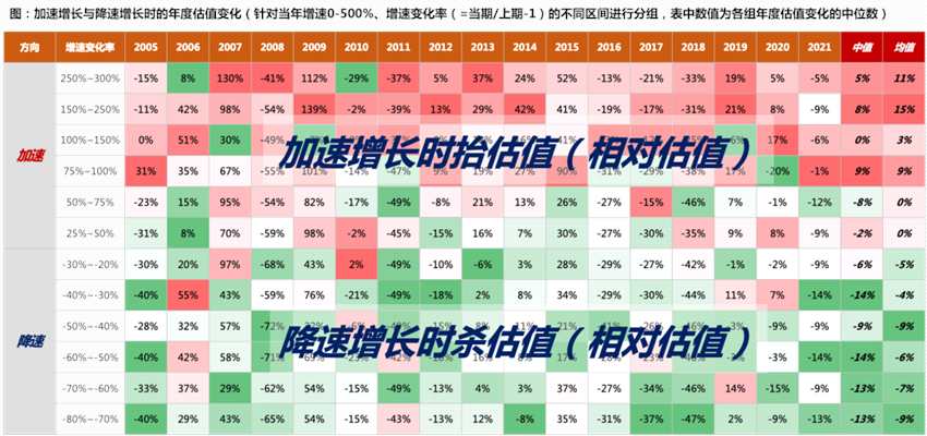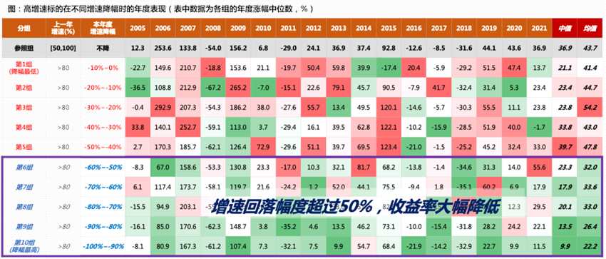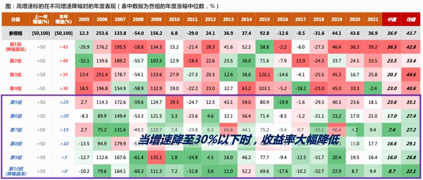 (1)增速邊際回落,但維持較高增速的標(biāo)的,仍有超額收益(第1組~第4組);(2)第4組是臨界線(增速>30%),當(dāng)增速降至30%以下,市場表現(xiàn)顯著變差
