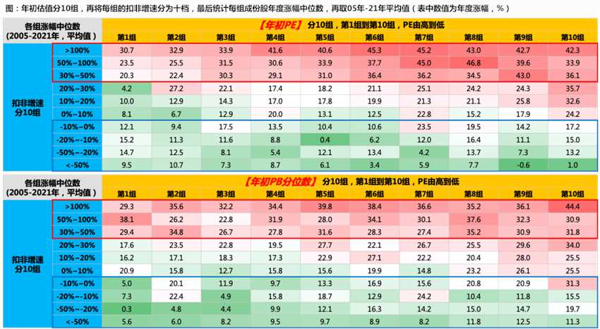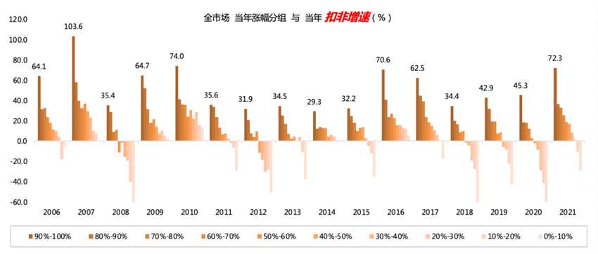 下圖中,我們把每個年度個股漲幅分十組,由左到右(柱狀顏色由深到淺),漲幅分別由高到低;其中柱子的高低,表示該組公司當(dāng)年扣非增速的中位數(shù)。