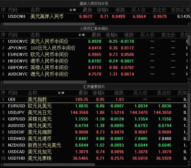 外匯市場也懵了。剛剛才開始調整的美元指數(shù)再度飆升,非美貨幣全線殺跌,人民幣大跌近500點,日元逼近145。
