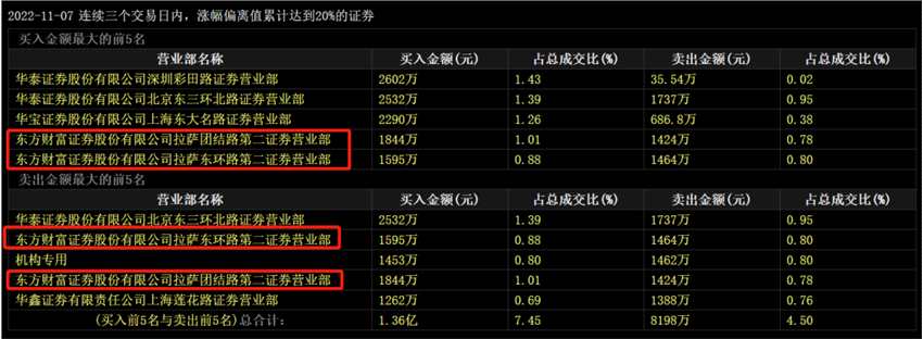 以公司最近兩個交易日龍虎榜為例,知名游資財通證券杭州上塘路營業(yè)部現(xiàn)身11月8日買二位置,其在當(dāng)日買入西安飲食2296萬元,賣出3.12萬元;有“散戶集中營”之稱的東方財富拉薩團(tuán)結(jié)路第二營業(yè)部、拉薩東環(huán)路第二營業(yè)部現(xiàn)身11月7日龍虎榜買四、買五位置,二者在連續(xù)三個交易日內(nèi)分別累計買入1844萬元、1595萬元。同時,二者還在11月7日來的三個交易日分別賣出1424萬元、1464萬元。