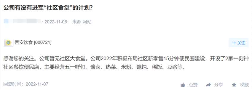 此外,西安飲食還自帶眼下市場關(guān)注度高的“社區(qū)食堂”概念。雖然公司在回復(fù)投資者提問時稱公司暫無社區(qū)大食堂,但公司亦表示2022年積極布局社區(qū)新零售15分鐘便民圈建設(shè),開設(shè)了2家一刻鐘社區(qū)餐飲便民店,主要經(jīng)營五一鮮包、醬鹵、熱菜等。