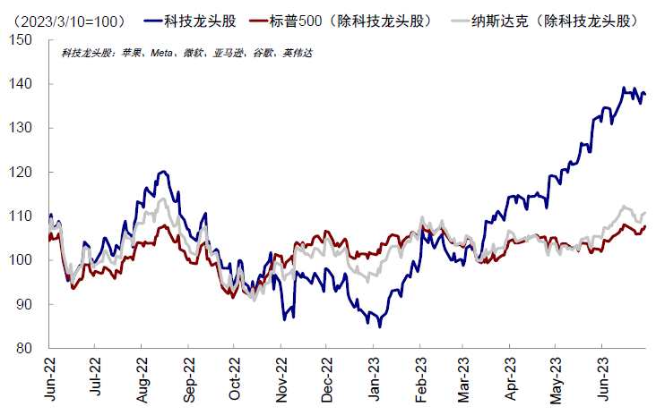 美聯(lián)儲維持鷹派、經(jīng)濟(jì)數(shù)據(jù)表現(xiàn)強(qiáng)勁支撐本月加息預(yù)期持續(xù)升溫。6月FOMC美聯(lián)儲“按兵不動”,將基準(zhǔn)利率維持在5%-5.25%,但會議更新的“點陣圖”及鮑威爾本月的多次發(fā)言均表示年內(nèi)仍有兩次加息可能,態(tài)度明顯偏鷹。另一方面,包括一季度GDP、房地產(chǎn)新屋開工及銷售、耐用品訂單等一系列數(shù)據(jù)均較為強(qiáng)勁,加息預(yù)期進(jìn)一步升溫,帶動美債利率再度抬升至3.8%以上。短期投資者情緒和資金抱團(tuán)持續(xù)支撐美股科技龍頭股表現(xiàn),但主要經(jīng)濟(jì)數(shù)據(jù)的好轉(zhuǎn)同樣帶動價值板塊反彈,其中銀行股受益于月末美聯(lián)儲公布的壓力測試,結(jié)果顯示極端情形下美國大銀行能夠抵御嚴(yán)重經(jīng)濟(jì)衰退帶來的沖擊。