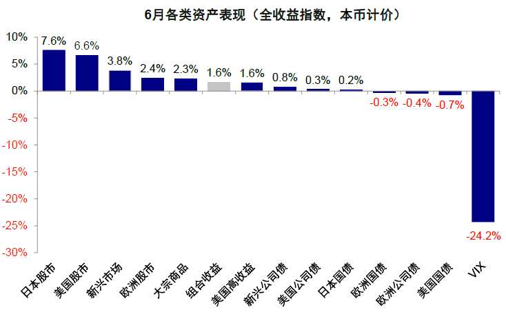 圖表32:6月,我們的海外資產(chǎn)配置組合上漲1.6%(本幣計價)