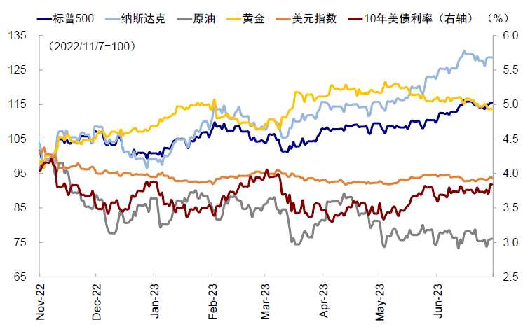 6月的全球市場有一些變化但基本延續(xù)此前格局。變的是,跑輸?shù)闹袊袌鲈谡哳A(yù)期下有所反彈,但持續(xù)性還不穩(wěn)固。不變的是,美股龍頭科技股依然領(lǐng)先,盡管中間一度因超買和加息擔(dān)憂回調(diào)。此外,6月FOMC與鮑威爾后續(xù)鷹派表態(tài)都未能讓市場“相信”9月會再度加息,因此10年美債在3.8%一線未能更進(jìn)一步。我們在《中美市場分化能否逆轉(zhuǎn)?海外資產(chǎn)配置月報(2023-6)》中提示美股可能面臨擾動但頭部公司仍有韌性、美債短期維持在3.8%左右、美元短期100~105窄幅震蕩、以及黃金短期內(nèi)吸引力下降合理中樞1,900美元基本都得到兌現(xiàn)。