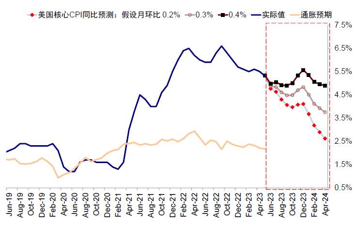 不過考慮到7月后通脹大概率加速下行,故如果美股和美債出現(xiàn)明顯回調(diào),反而可能提供更好再介入時機(jī),因為一旦越過7月的低基數(shù),核心通脹會迎來8~9月連續(xù)兩個月的高基數(shù),有望開啟加速下行階段。我們測算三季度末有望回到3.5%附近,這進(jìn)而有助于緩解通脹壓力和9月加息擔(dān)憂。