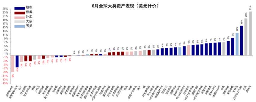 圖表1:6月,美元計價下,股>大宗>債,天然氣、大豆、比特幣、海外中資股及美股領(lǐng)漲,俄羅斯股匯領(lǐng)跌