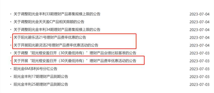 7月3日,光大理財(cái)發(fā)布兩則費(fèi)率優(yōu)惠活動(dòng)公告。公告顯示,7月6日(含)起陽(yáng)光碧靈活2號(hào)(EW0761)產(chǎn)品管理費(fèi)優(yōu)惠至0.05%/年,銷售服務(wù)費(fèi)由說明書約定的0.30%/年優(yōu)惠至0.15%/年。