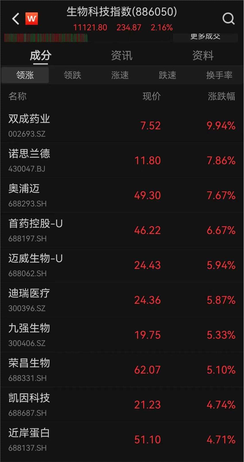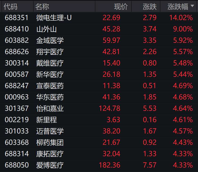 微電生理、山外山大漲超10%,金域醫(yī)學(xué)、翔宇醫(yī)療、戴維醫(yī)療、新華醫(yī)療等漲超5%。