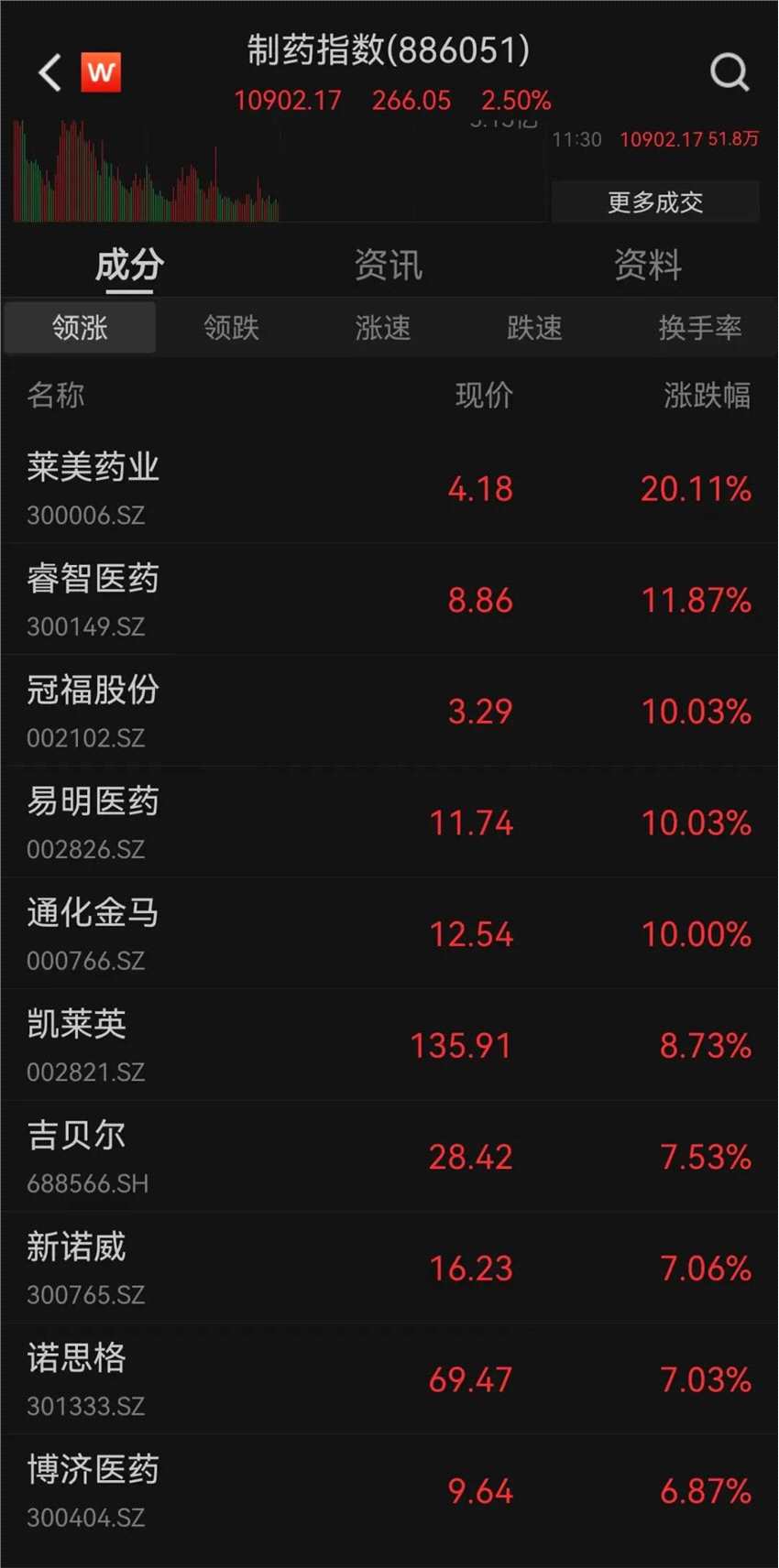 制藥指數(shù)大漲,萊美藥業(yè)20%漲停,另有多只個(gè)股10%漲停。