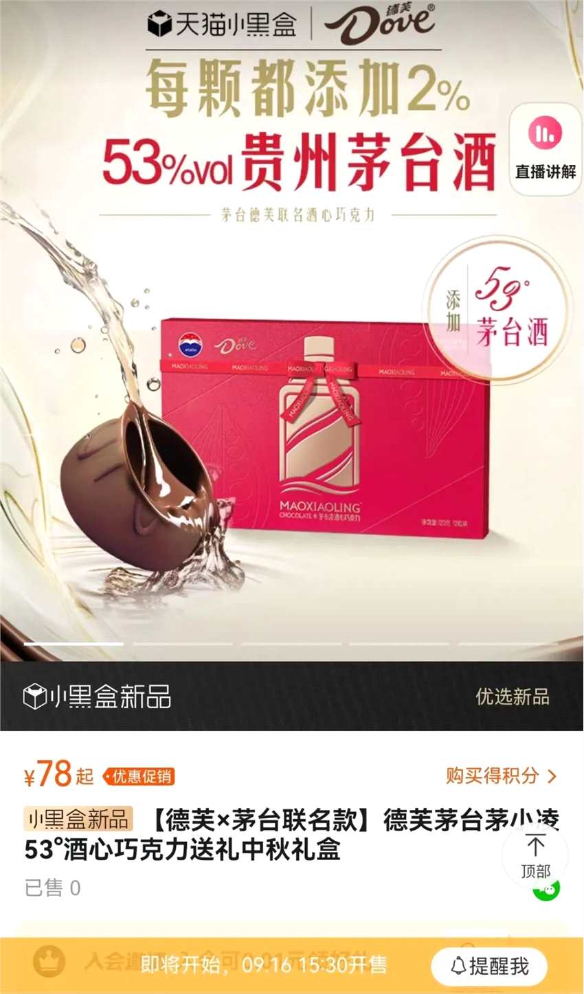 據(jù)德芙天貓官方旗艦店消息,茅臺(tái)德芙聯(lián)名酒心巧克力將于9月16日15:30開售。