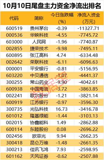 貴州茅臺(tái)、華映科技、人民網(wǎng)、捷榮技術(shù)、張江高科等尾盤主力資金凈流出均超6000萬元。