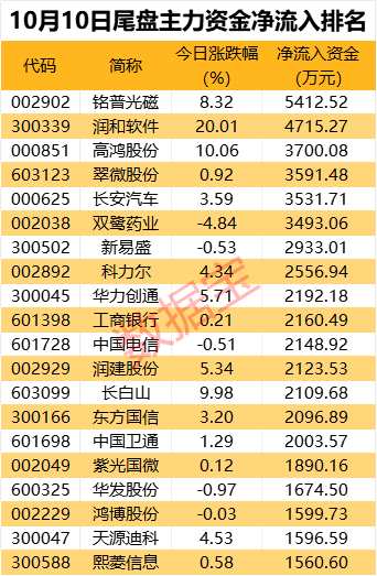 個(gè)股方面,銘普光磁(維權(quán))、潤(rùn)和軟件、高鴻股份、翠微股份、長(zhǎng)安汽車、雙鷺?biāo)帢I(yè)6股尾盤獲主力搶籌超3000萬元。