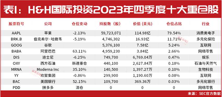據(jù)H&H國(guó)際投資2月14日披露的持倉報(bào)告顯示,截至2023年年末,其持倉美股股票總市值近145 億美元(人民幣超過千億元)。從具體持倉個(gè)股來看,第一的重倉股為蘋果,持倉114.98億美元,倉位占比高達(dá)近80%,此外,持倉伯克希爾·哈撒韋的市值同樣較高,接近17億美元,倉位占比為11.71%。此外,其還持倉谷歌、阿里巴巴、迪士尼等公司(見表1)。
