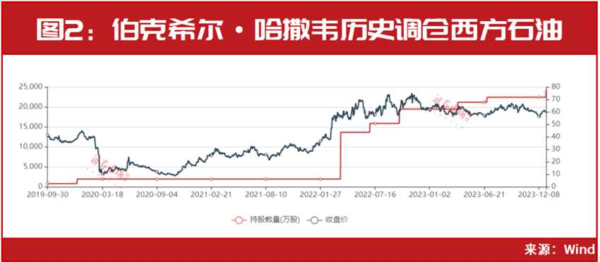 回顧來看,巴菲特對(duì)于雪佛龍和西方石油進(jìn)行了多輪調(diào)倉,而“態(tài)度”卻有些不同。從歷史持倉來看,巴菲特曾于2020年三季度建倉雪佛龍,在此之后進(jìn)行了連續(xù)增倉,而在此后多個(gè)季度均進(jìn)行了減倉,如2022年四季度~2023年三季度(見圖1)。