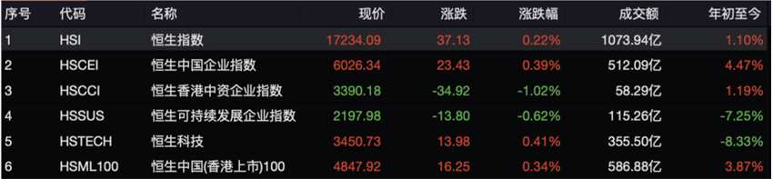 9月10日,恒生指數(shù)漲0.22%,報(bào)17234.09點(diǎn);恒生科技指數(shù)漲0.41%,報(bào)3450.73點(diǎn);恒生國(guó)企指數(shù)漲0.39%,報(bào)6026.34點(diǎn)。大市成交1073.94億港元,南向資金凈買(mǎi)入額達(dá)92.89億港元。