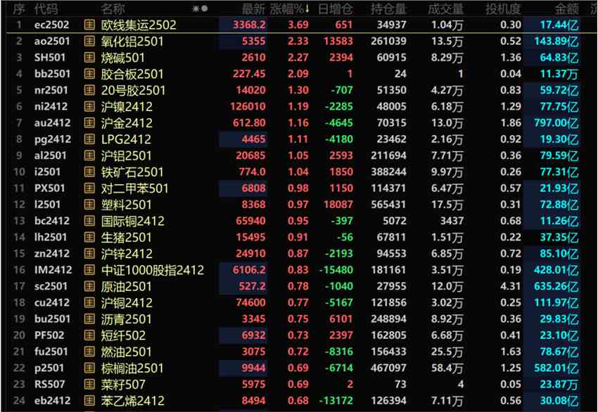 一是,期貨市場主力合約集體拉升。內(nèi)盤期貨主力合約集運歐線一度漲超3%,該合約從9月份以來已經(jīng)翻倍。同時,氧化鋁、燒堿漲超2%,滬鎳、滬金、滬鋁、鐵礦漲超1%,燃油、液化石油氣(LPG)、鐵礦一度漲超1%。這意味著,市場對于經(jīng)濟有著積極的預(yù)期。