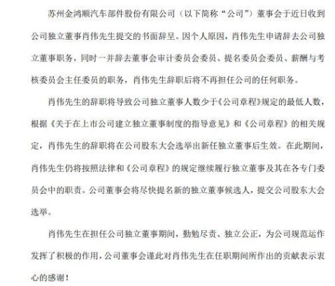 摘要: 5月7日消息,近日金鴻順(603922)董事會收到公司獨(dú)立董事肖偉提交的書面辭呈。