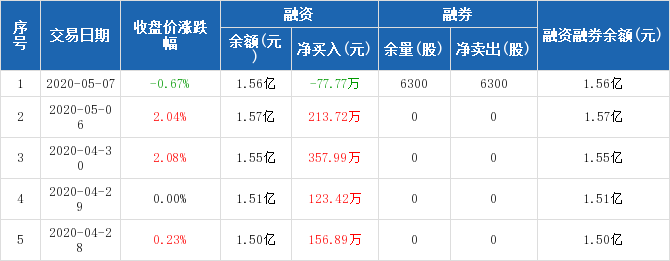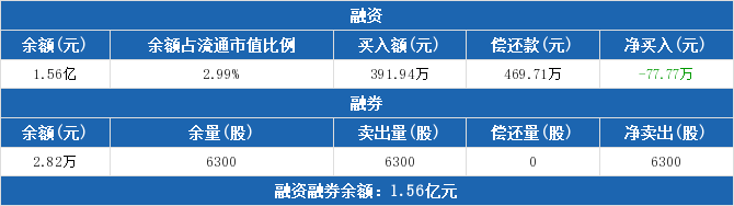 融資方面,當(dāng)日融資買入391.94萬元,融資償還469.71萬元,融資凈償還77.77萬元。融券方面,融券賣出6300股,融券償還0股,融券余量6300股,融券余額2.82萬元。融資融券余額合計1.56億元。