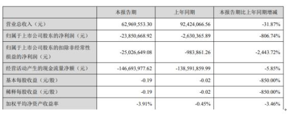 據(jù)了解,2020年第一季度,公司實(shí)現(xiàn)營業(yè)收入6,296.96萬元,較上年同期減少31.87%;歸屬于上市公司股東的凈利潤-2,385.07萬元,較上年同期減少806.74%。