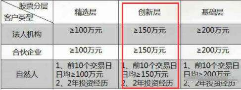 交易新三板創(chuàng)新層股票需要開通新三板創(chuàng)新層的權(quán)限,新三板創(chuàng)新層的開通條件為前10個(gè)交易日日均資產(chǎn)在100萬以上;且必須有兩年股票交易經(jīng)驗(yàn),并且其風(fēng)險(xiǎn)承受能力在C4以上。