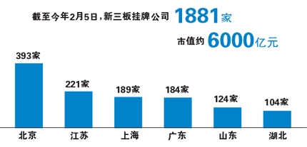 數(shù)據(jù)顯示,截至今年2月5日,僅隔一年,新三板掛牌公司已達(dá)1881家,總市值約6000億元,日均成交2467筆。其中,北京市掛牌公司393家,在各省份中排名第一,占比約兩成,具有顯著的信息技術(shù)、高技術(shù)特征,其中信息傳輸、軟件和信息技術(shù)服務(wù)業(yè)156家,占北京市掛牌公司數(shù)的近40%;高技術(shù)企業(yè)占比在80%以上。