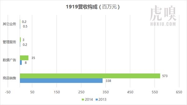 1919的主要收入來自線下直營門店和線上銷售,2014年商品銷售收入5.73億,占營收的93.82%。數(shù)據(jù)廣告、管理服務(wù)剛剛起步,無足輕重。
