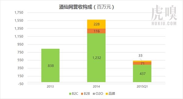 2013年,酒仙網(wǎng)的營收幾乎全部來自2C業(yè)務(wù),2014年增加了2B業(yè)務(wù)和品牌運營,2C業(yè)務(wù)營收占比降至85.4%,但在2015年Q1又升至93%。
