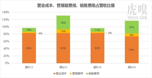 2013年,酒仙網(wǎng)營收是1919的2.5倍,2014年擴大到2.58倍。由于毛利潤率較高,2014年酒仙網(wǎng)毛利潤的絕對值幾乎是1919的4倍(兩家的毛利潤分別為1.03億和4.07億).