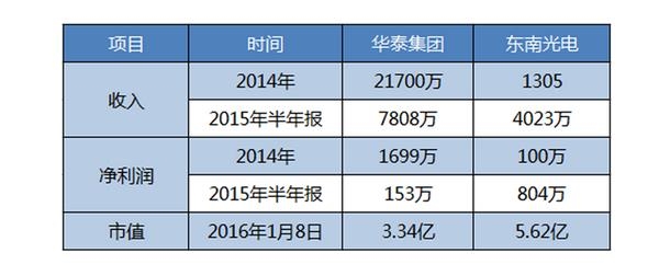 先對比下華泰集團(tuán)和東南光電的基本數(shù)據(jù)。華泰集團(tuán)2014年收入2.17億元,凈利潤1699萬元;東南光電2014年收入1305萬元,凈利潤100萬元。