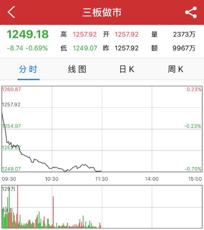今日是農(nóng)歷新年來的首個交易周,早盤三板做市遭遇猴年當(dāng)頭一棒。開盤后即直線下挫,盤中于弱勢整理。截至午間收盤,三板做市指數(shù)報1249.18點,跌8.74點,跌幅0.69%,半日成交9967.00萬元。