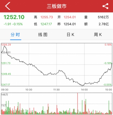 今日三板做市指數(shù)繼續(xù)弱勢(shì)震蕩,雖然尾盤(pán)再次出現(xiàn)拉升,但未能翻紅。截至收盤(pán),三板做市指數(shù)報(bào)1252.10,跌1.90,跌幅0.15%,成交額2.78億。