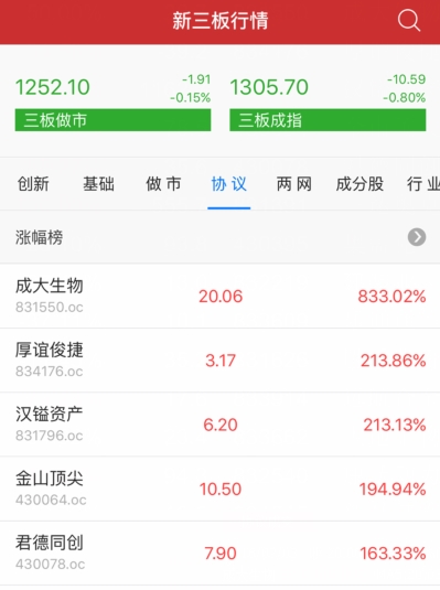 協(xié)議轉(zhuǎn)讓方面,182家公司發(fā)生交易,成交6204.17萬(wàn)股,成交額1.78億元。其中,成大生物漲833.02%,領(lǐng)漲協(xié)議轉(zhuǎn)讓股。