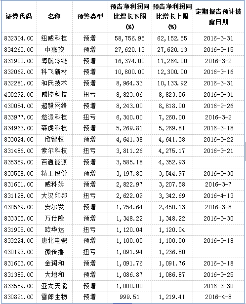 在已發(fā)布業(yè)績預(yù)告的公司中,預(yù)告業(yè)績增長最快的是紐威科技,增幅高達(dá)587.57倍至621.53倍。排名第二為中惠旅,預(yù)計2015年凈利潤3071.39萬元,同比增長27620.13%。兩家業(yè)績暴增的主要原因均在于同比基數(shù)較低。