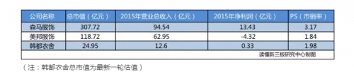 不妨看看韓都衣舍和美邦服飾的估值對(duì)比,根據(jù)讀懂新三板研究中心的數(shù)據(jù),按PS(市值/銷售額)計(jì)算,韓都衣舍PS1.98,美邦服飾PS1.87。當(dāng)然,你要知道美邦服飾正遭遇困境,所以可以再看看其他公司的情況,比如森馬服飾PS3.17。三家公司的估值不妨看下表。