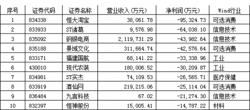 2015年新三板營業(yè)虧損最大的前10家掛牌企業(yè)