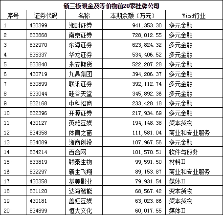 數據來源:Wind 整理:新三板資本圈 最后來看一下新三板上真正睡在錢堆上的金主們9無疑問,這個榜單又被資本玩家們“玩壞了”——前十名被金融行業(yè)包攬,前20家公司中就有11家來自金融行業(yè)!