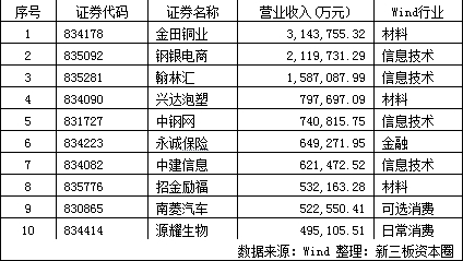 2015年新三板營業(yè)收入最高的十家掛牌企業(yè)