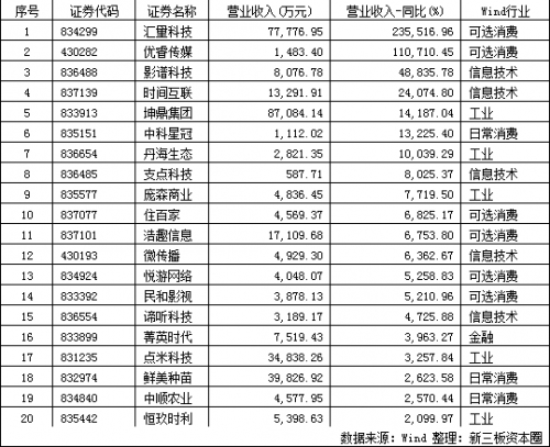 2015年新三板收入增長最快的20家掛牌企業(yè)