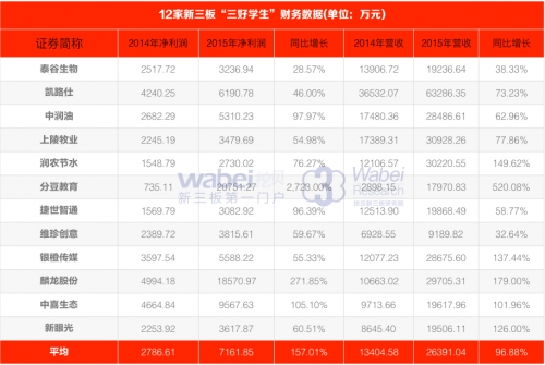 12家新三板”三好學(xué)生財(cái)務(wù)數(shù)據(jù) 從凈利潤(rùn)來(lái)看,12家公司2014年、2015年凈利潤(rùn)平均分別為2787萬(wàn)元、7162萬(wàn)元,增長(zhǎng)幅度為157%。