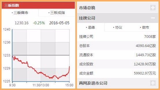 【掛牌公司突破7000家 成交額跌破6億元】5月5日,新三板新增18家掛牌企業(yè),3家做市企業(yè),15家為協(xié)議轉(zhuǎn)讓。至此,新三板掛牌企業(yè)總數(shù)達(dá)7008家,其中協(xié)議轉(zhuǎn)讓企業(yè)5516家,做市轉(zhuǎn)讓企業(yè)1492家。三板做市指數(shù)收報(bào)1230.16點(diǎn),微跌0.25%,三板成指報(bào)收1273.54點(diǎn),微漲1.01%。
