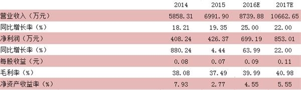 公司公布了 2015 年年度報(bào)告,2015 年公司營(yíng)收達(dá)到 6991.90 萬元,同比增長(zhǎng) 19.35%,歸屬于掛牌公司股東的凈利潤(rùn)達(dá)到 426.37 萬元,同比增長(zhǎng) 4.44%,基本每股收益為 0.07 元,同比降低12.50%,歸屬于掛牌公司股東凈資產(chǎn)達(dá)到 15372.21 萬元,同比增長(zhǎng) 198.58%。業(yè)績(jī)?cè)鲩L(zhǎng)較為穩(wěn)定。