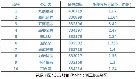 以下是截至目前為止,新三板股權(quán)質(zhì)押數(shù)位于前十的公司:
