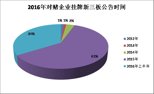 新三板府并發(fā)現(xiàn),在2015年1月1日至2016年7月8日采取對(duì)賭的183家企業(yè)中,掛牌時(shí)間大多集中在2015年、2016年,占比高達(dá)95%,其中2015年掛牌的占比61%,2016年上半年掛牌的占比34%。