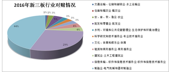而根據(jù)新三板府的統(tǒng)計(jì),參與對(duì)賭的企業(yè)更集中分布于信息傳輸、軟件和信息技術(shù)服務(wù)業(yè)以及制造業(yè)-電氣機(jī)械和器材制造業(yè),其中制造業(yè)參與新三板對(duì)賭比例占參與對(duì)賭企業(yè)的44%。
